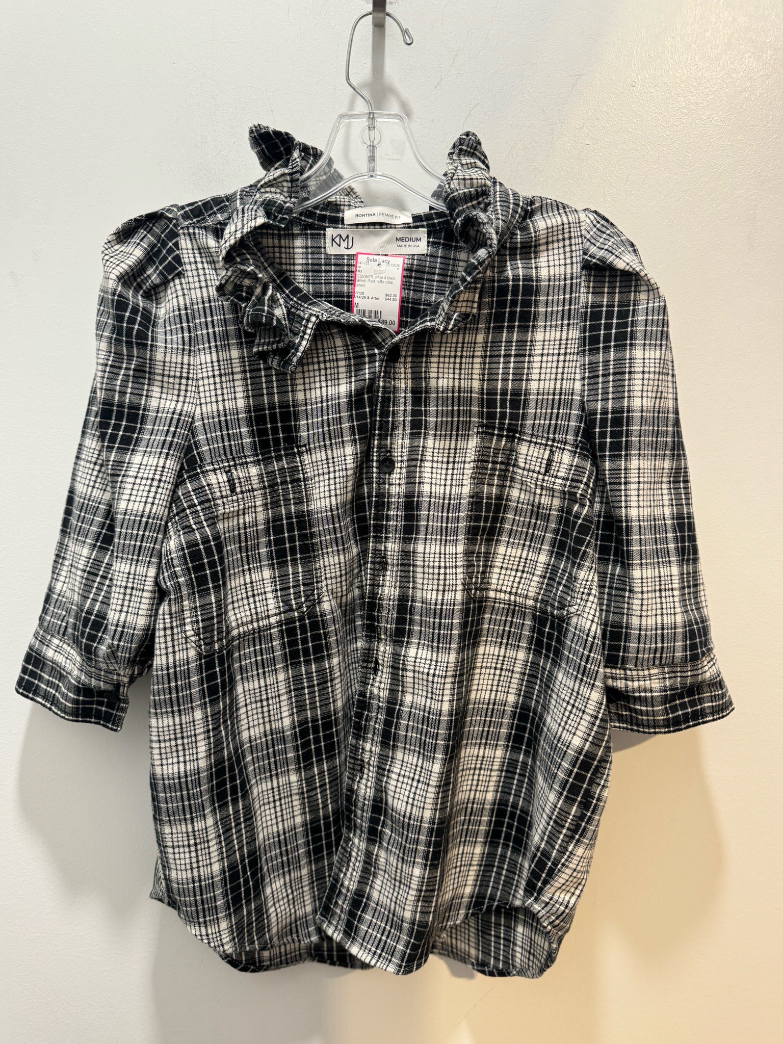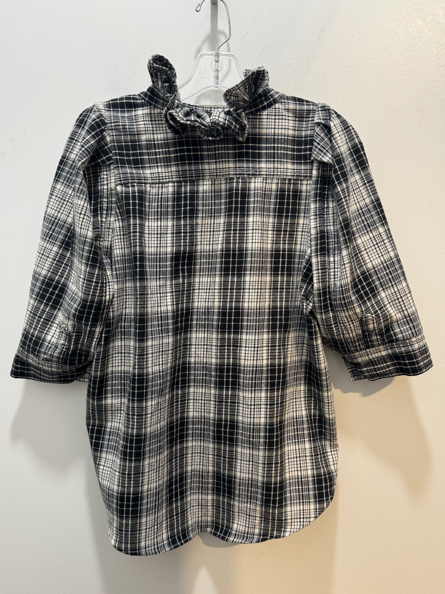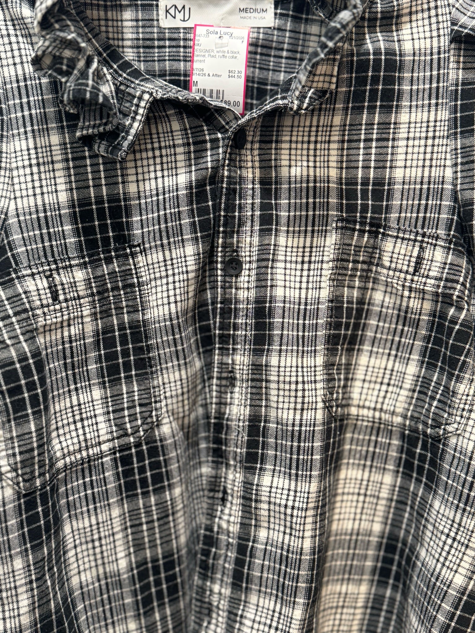 KMJ white & black Flannel Plaid ruffle collar button down Top, Size M