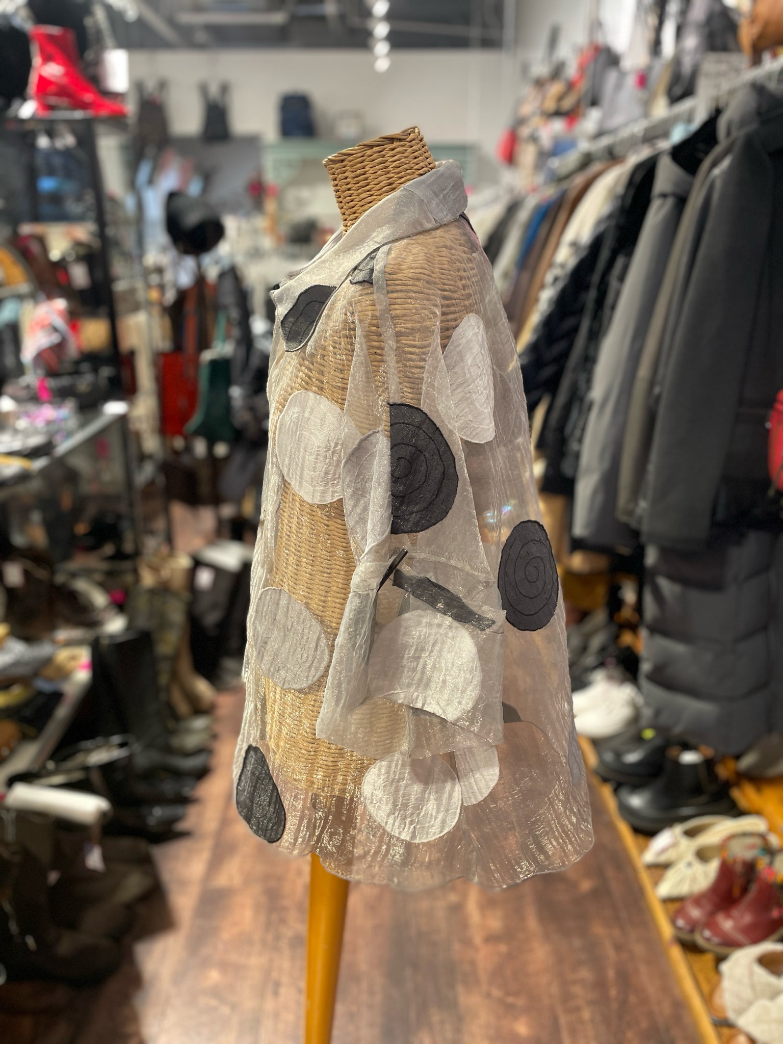 Moonlight gray & black sheer Circles Flowy Top, Size S