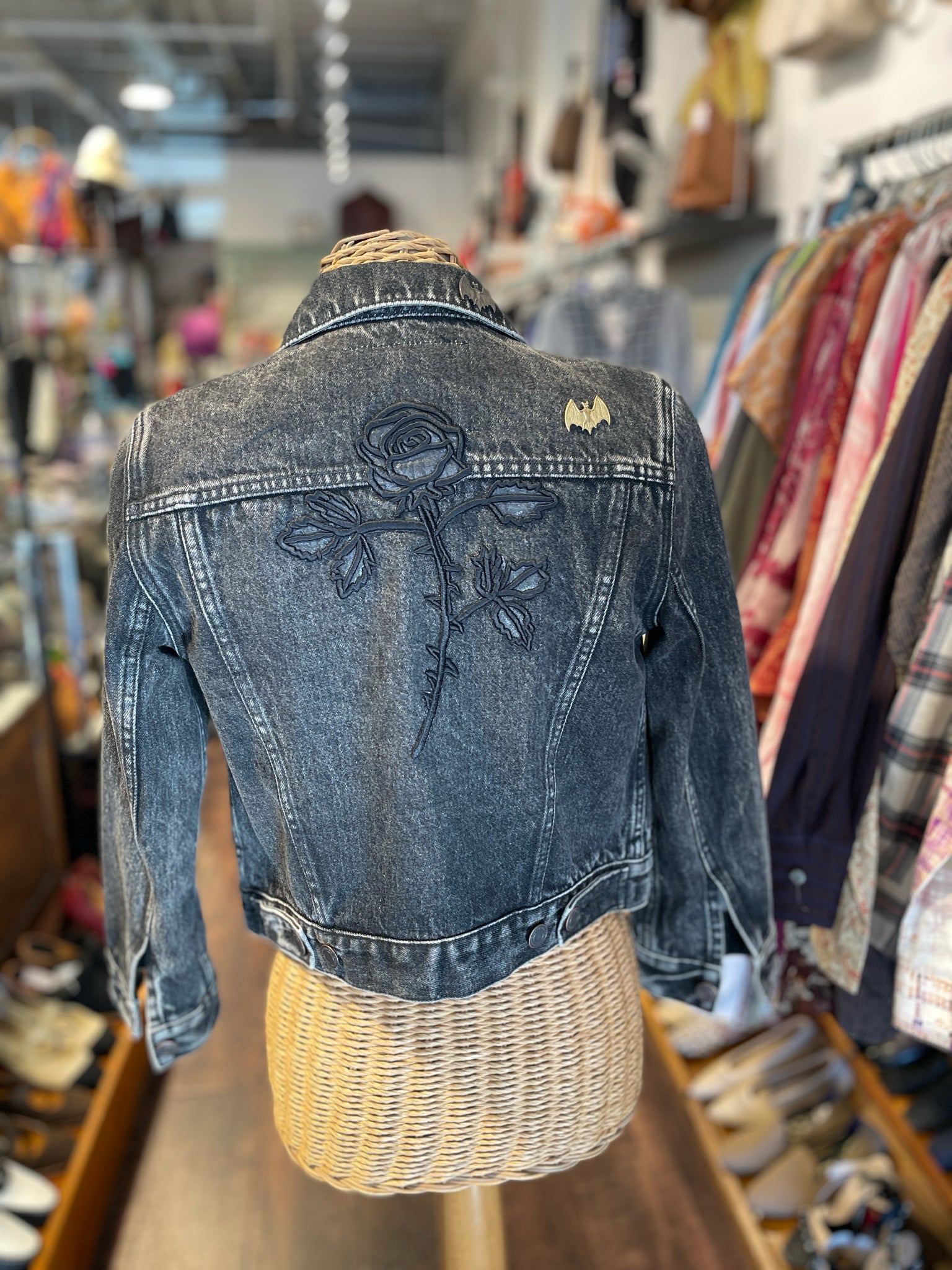 • Load image into Gallery viewer, Marc Jacobs Black Cotton Denim Cropped "Disney" embellished Jacket, Size S